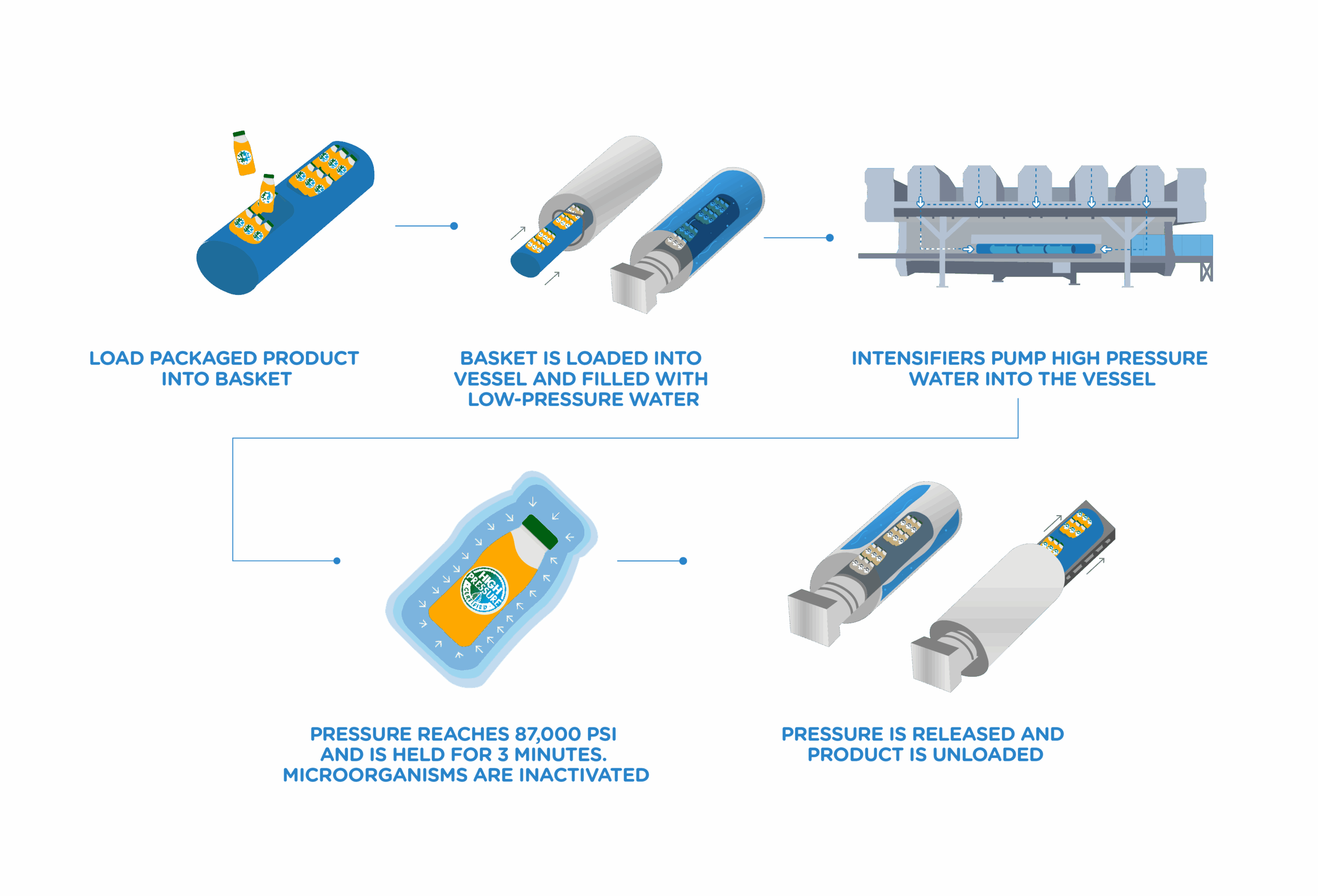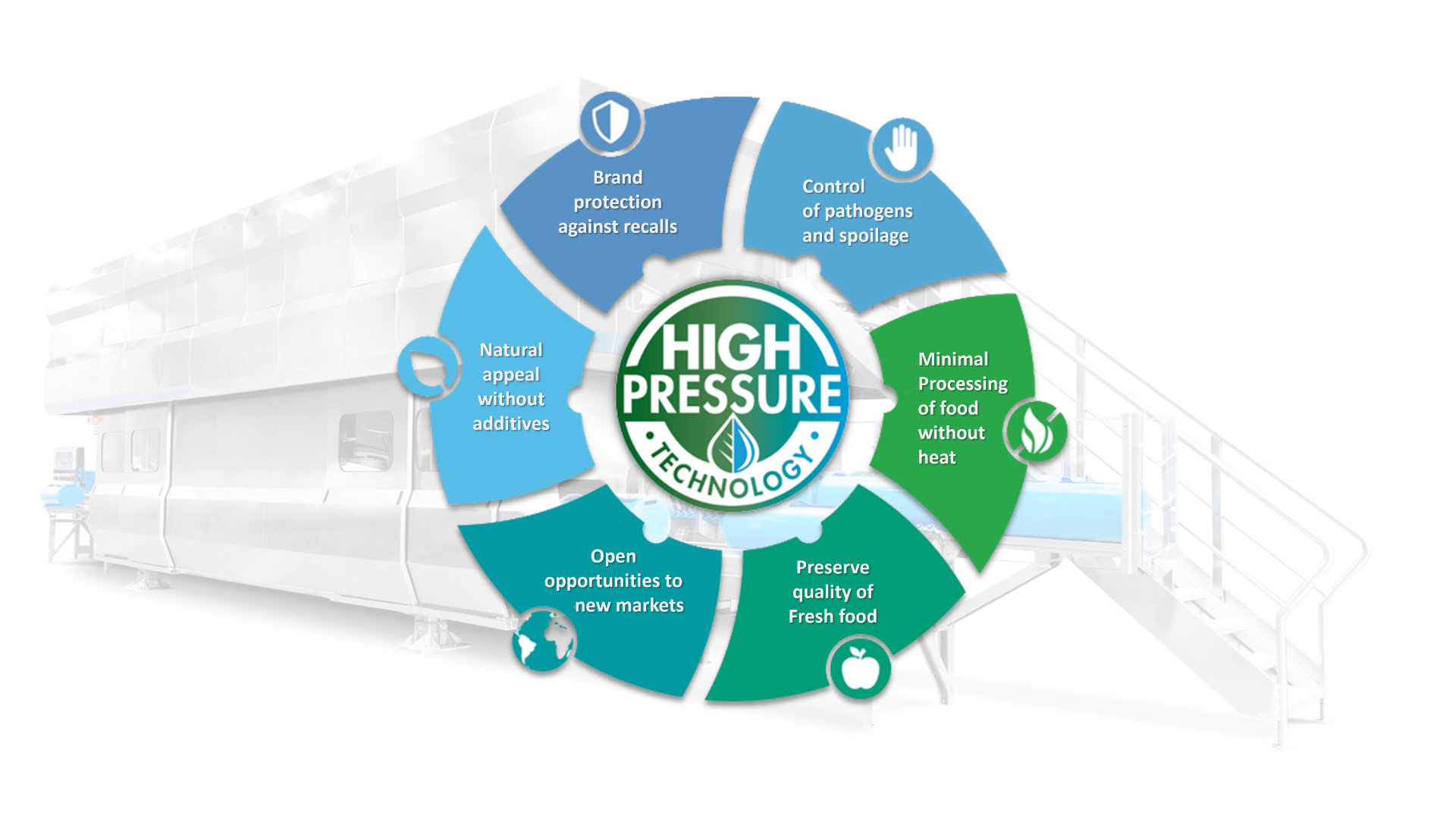 It is based on the use of high isostatic pressure transmitted by water of up to 6,000 bar /600MPa /87,000 psi, held for a few minutes. This pressure is transmitted uniformly and instantaneously throughout the product, therefore achieving an effect equivalent to pasteurization, except without the use of heat.